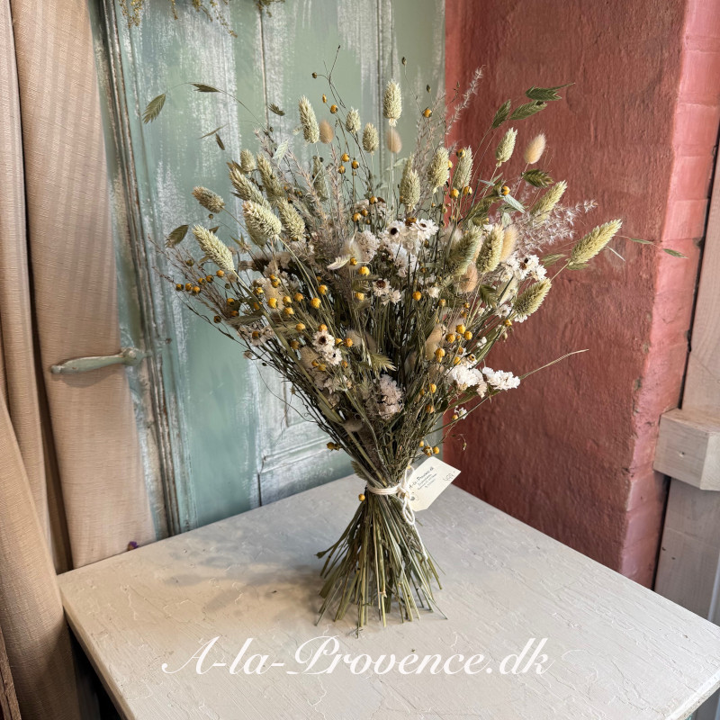 Ines, evighedsbuket bundet af bæredygtige tørrede blomster vi selv har dyrket på egen mark. Buketten måler ca 50 cm i højden og ca 30 cm i diameter. Buketten er bundet af primært økologiske blomster: kanariegræs, harehale, papirknop, hør og enkelte ikke økologiske: fladaks, elefantgræs.
