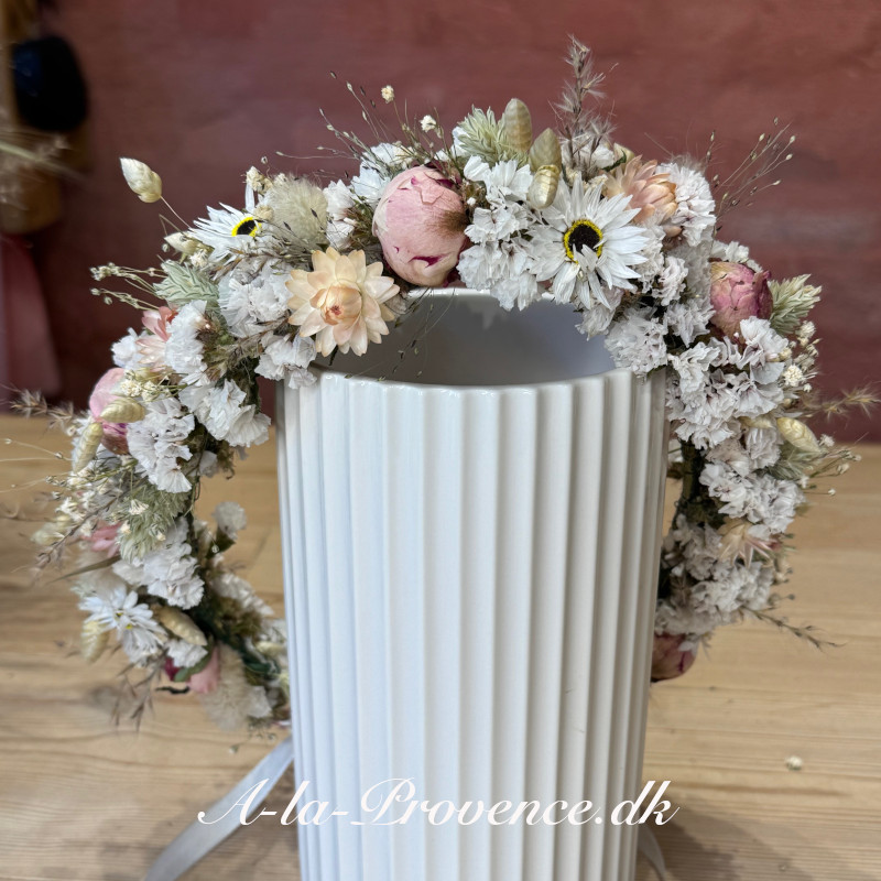 Berdine, evighedskrans, til konfirmanden eller bruden. Bundet af bæredygtige tørrede blomster vi selv har dyrket på egen mark. Kransen måler ca 28 cm i diameter. Kransen er bundet på ståltråd med primært økologiske blomster: evighedsblomst, harehale, hjertegræs, statice, nikkeknop, kanariegræs, fontænegræs og enkelte ikke økologiske: bonderose, pampas og brudeslør. Kan justeres med bånd bagpå.