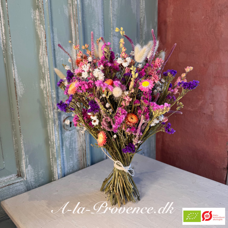 Celine, økologisk evighedsbuket bundet af bæredygtige økologiske tørrede blomster vi selv har dyrket på egen mark. Buketten måler ca 40 cm i højden og ca 30 cm i diameter. Buketten er bundet af statice, papirknop, evighedsblomst, ridderspore, harehale, havekarse, akshindebæger og nikkeknop.