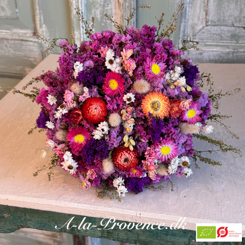 Mandira, økologisk evighedsbuket bundet af bæredygtige økologiske tørrede blomster vi selv har dyrket på egen mark. Buketten måler ca 25 cm i højden og ca 22 cm i diameter. Buketten er bundet af statice, papirknop, evighedsblomst, ridderspore, harehale, havekarse og nikkeknop.