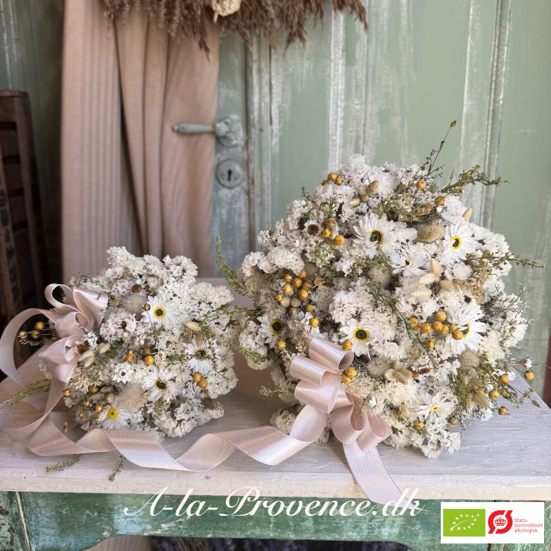 Økologisk Mor/barn, evighedsbuket Tessa, bundet af bæredygtige tørrede blomster vi selv har dyrket på egen mark. Buketten måler ca 25 cm i højden og ca 22 cm i diameter. Lille buket ca 1/2 størrelse. Buketterne er bundet af statice, nikkeknop, papirknop, hjertegræs, hør, nyserøllike, havekarse, vilde græsser og harehale.