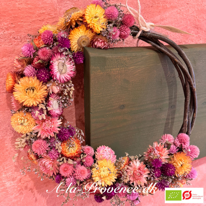 Chantall, økologisk evighedskrans bundet af bæredygtige tørrede blomster vi selv har dyrket på egen mark. Kransen måler ca 28 cm i diameter. Kransen er bundet på pilegrene med ungkarleknap, staude statice, liden græs og evighedsblomst.